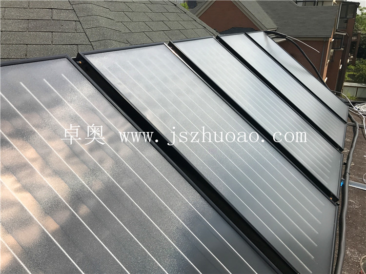 此工程為用戶生活用熱水,配置了5塊平板太陽能加500升承壓水箱帶盤管換熱,平板運行介質(zhì)為-25度太陽能專用防凍液,水溫不夠的情況下使用燃氣鍋爐輔助,家里24小時提供55度熱水。